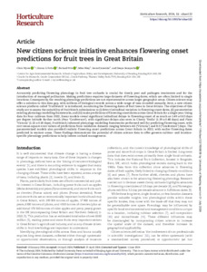 Wyver, C. ORCID: https://orcid.org/0000-0002-8661-0859, Potts, S. G. ORCID: https://orcid.org/0000-0002-2045-980X, Pitts, R., Riley, M., Janetzko, G. and Senapathi, D. ORCID: https://orcid.org/0000-0002-8883-1583 (2024) New citizen science initiative enhances flowering onset predictions for fruit trees in Great Britain. Horticulture Research, 11 (6). uhae122. ISSN 2052-7276 doi: 10.1093/hr/uhae122