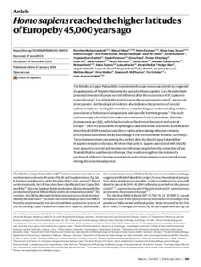 Mylopotamitaki, D., Weiss, M., Fewlass, H., Irene Zavala, E., Rougier, H., Pelin Sümer, A., Hajdinjak, M., Smith, G. M., Ruebens, K. ORCID: https://orcid.org/0000-0002-5621-5786, Sinet-Mathiot, V., Pederzani, S., Essel, E., Harking, F. S., Xia, H., Hansen, J., Kirchner, A., Lauer, T., Stahlschmidt, M., Hein, M., Talamo, S., Wacker, L., Meller, H., Dietl, H., Orschiedt, J., Olsen, J. V., Zeberg, H., Prüfer, K., Krause, J., Meyer, M., Welker, F., McPherron, S. P., Schüler, T. and Hublin, J.-J. (2024) Homo sapiens reached the higher latitudes of Europe by 45,000 years ago. Nature, 626 (7998). pp. 341-346. ISSN 1476-4687 doi: 10.1038/s41586-023-06923-7
