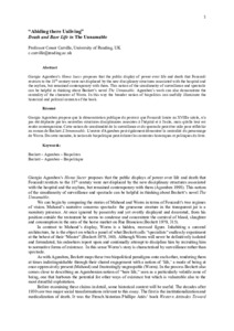 Giorgio Agamben’s Homo Sacer proposes that the public display of power over life and death that Foucault restricts to the 18th century were not displaced by the new disciplinary structures associated with the hospital and the asylum, but remained contemporary with them. This notion of the simultaneity of surveillance and spectacle can be helpful in thinking about Beckett’s novel The Unnamable. Agamben’s work can also demonstrate the centrality of the character of Worm. In this way the broader notion of biopolitics can usefully illuminate the historical and political contexts of the book.
