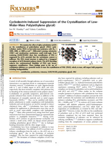 Hamley, I. W. ORCID: https://orcid.org/0000-0002-4549-0926 and Castelletto, V. ORCID: https://orcid.org/0000-0002-3705-0162 (2024) Cyclodextrin-induced suppression of the crystallization of low-molar-mass poly(ethylene glycol). ACS Polymers Au, 4 (4). pp. 266-272. ISSN 2694-2453 doi: 10.1021/acspolymersau.4c00024