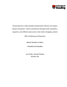 Shaban, A. F. A. (2022) Examining how online product presentation formats can impact female consumers’ choice satisfaction through tactile sensations, cognitive, and affective processes in the online shopping context. PhD thesis, University of Reading. doi: 10.48683/1926.00116389