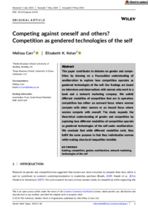 This paper contributes to debates on gender and competition by drawing on a Foucauldian understanding of neoliberalism to explore how competition operates as gendered technologies of self. Our findings are based on interviews and observations with women who work in a bank and a network marketing company. We unfold different modalities of competition that are in operation: competition has either an outward focus where women compete with other women or an inward focus where women compete with oneself. The study expands the theoretical understanding of gender and competition by exploring how different modalities of competition operate as gendered technologies of the self under neoliberalism. We conclude that while different modalities exist, they fulfil the same purpose in that they individualise women while making structural inequalities invisible.
