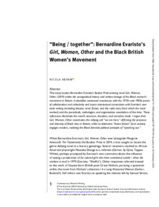 Abram, N. ORCID: https://orcid.org/0000-0002-9695-0494 (2024) "Being / together": Bernardine Evaristo’s Girl, Woman, Other and the Black British women’s movement. Contemporary Women's Writing, 18. vpae018. ISSN 1754-1484 doi: 10.1093/cww/vpae018