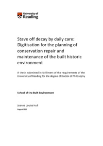 Hull, J. L. (2022) Stave off decay by daily care: digitisation for the planning of conservation repair and maintenance of the built historic environment. PhD thesis, University of Reading. doi: 10.48683/1926.00116454