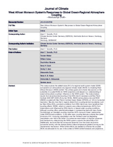 Tamoffo, A. T., Weber, T., Cabos, W., Monerie, P.-A. ORCID: https://orcid.org/0000-0002-5304-9559, Cook, K. H., Sein, D. V., Dosio, A., Klutse, N. A. B., Akintomide, A. A. and Jacob, D. (2024) West African monsoon system's responses to global ocean-regional atmosphere coupling. Journal of Climate. ISSN 1520-0442 doi: 10.1175/JCLI-D-23-0749.1