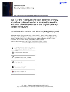 Cumper, P., S. Adams, K. Onyejekwe, and M. O’Reilly. 2024. "Teachers’ Perspectives on Relationships and Sex Education Lessons in England." Sex Education 24 (2): 238-254. doi:10.1080/14681811.2023.2171382