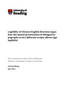 Zhang, Y. (2022) Legibility of Chinese-English direction signs: how the spatial presentation of bilingual typography in two different scripts affects sign legibility. PhD thesis, University of Reading. doi: 10.48683/1926.00116734