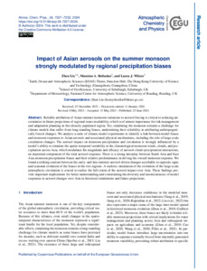 Liu, Z., Bollasina, M. A. and Wilcox, L. J. ORCID: https://orcid.org/0000-0001-5691-1493 (2024) Impact of Asian aerosols on the summer monsoon strongly modulated by regional precipitation biases. Atmospheric Chemistry and Physics, 24 (12). pp. 7227-7252. ISSN 1680-7324 doi: 10.5194/acp-24-7227-2024