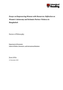 Afrin, J. (2024) Essays on empowering women with resources: reflection on women’s autonomy and intimate partner violence in Bangladesh. PhD thesis, University of Reading. doi: 10.48683/1926.00116953