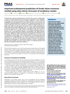 Bach, E. ORCID: https://orcid.org/0000-0002-9725-0203, Krishnamurthy, V., Mote, S., Shukla, J., Surjalal Sharma, A., Kalnay, E. and Ghil, M. (2024) Improved subseasonal prediction of South Asian monsoon rainfall using data-driven forecasts of oscillatory modes. Proceedings of the National Academy of Sciences of the United States of America, 121 (15). e2312573121. ISSN 1091-6490 doi: 10.1073/pnas.2312573121
