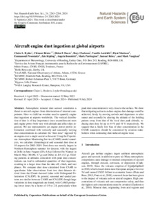 Atmospheric mineral dust aerosol constitutes a threat to aircraft engines from deterioration of internal components. Here we fulfil an overdue need to quantify engine dust ingestion at airports worldwide. The vertical distribution of dust is of key importance since ascent/descent rates and engine power both vary with altitude and affect dust ingestion. We use representative jet engine power profile information combined with vertically and seasonally varying dust concentrations to calculate the “dust dose” ingested by an engine over a single ascent or descent. Using the Copernicus Atmosphere Monitoring Service (CAMS) model reanalysis, we calculate climatological and seasonal dust dose at 10 airports for 2003–2019. Dust doses are mostly largest in Northern Hemisphere summer for descent, with the largest at Delhi in June–August (JJA; 7.5 g) followed by Niamey in March–May (MAM; 4.0 g) and Dubai in JJA (4.5 g). Holding patterns at altitudes coincident with peak dust concentrations can lead to substantial quantities of dust ingestion, resulting in a larger dose than the take-off, climb, and taxi phases. We compare dust dose calculated from CAMS to spaceborne lidar observations from two dust datasets derived from the Cloud–Aerosol Lidar with Orthogonal Polarization (CALIOP). In general, seasonal and spatial patterns are similar between CAMS and CALIOP, though large variations in dose magnitude are found, with CAMS producing lower doses by a factor of 1.9 to 2.8, particularly when peak dust concentration is very close to the surface. We show that mitigating action to reduce engine dust damage could be achieved, firstly by moving arrivals and departures to after sunset and secondly by altering the altitude of the holding pattern away from that of the local dust peak altitude, reducing dust dose by up to 44% and 41% respectively. We suggest that a likely low bias of dust concentration in the CAMS reanalysis should be considered by aviation stakeholders when estimating dust-induced engine wear.