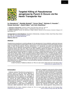 Atanaskovic, I., Mosbahi, K., Sharp, C. ORCID: https://orcid.org/0000-0002-9424-3622, Housden, N. G., Kaminska, R., Walker, D. and Kleanthous, C. (2020) Targeted killing of Pseudomonas aeruginosa by Pyocin G Occurs via the Hemin Transporter Hur. Journal of Molecular Biology, 432 (13). pp. 3869-3880. ISSN 1089-8638 doi: 10.1016/j.jmb.2020.04.020