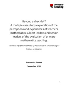 Parkes, S. (2024) Beyond a checklist? A multiple case study exploration of the perceptions and experiences of teachers, mathematics subject leaders and senior leaders of the evaluation of primary mathematics teaching. EdD thesis, University of Reading. doi: 10.48683/1926.00117406