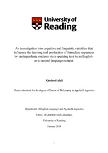 Alali, K. (2024) An investigation into cognitive and linguistic variables that influence the learning and production of formulaic sequences by undergraduate students via a speaking task in an English-as-a-second-language context. PhD thesis, University of Reading. doi: 10.48683/1926.00117435