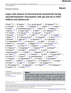 Kurth, F. ORCID: https://orcid.org/0000-0001-8662-1809, Schijven, D., van den Heuvel, O. A., Hoogman, M. ORCID: https://orcid.org/0000-0002-1261-7628, van Rooij, D., Stein, D. J., Buitelaar, J. K., Bölte, S., Auzias, G., Kushki, A., Venkatasubramanian, G., Rubia, K. ORCID: https://orcid.org/0000-0002-1410-7701, Bollmann, S., Isaksson, J., Jaspers‐Fayer, F., Marsh, R., Batistuzzo, M. C., Arnold, P. D., Bressan, R. A., Stewart, S. E., Gruner, P., Sorensen, L., Pan, P. M., Silk, T. J., Gur, R. C., Cubillo, A. I., Haavik, J., O'Gorman Tuura, R. L., Hartman, C. A., Calvo, R., McGrath, J., Calderoni, S., Jackowski, A., Chantiluke, K. C., Satterthwaite, T. D., Busatto, G. F., Nigg, J. T., Gur, R. E., Retico, A. ORCID: https://orcid.org/0000-0001-5135-4472, Tosetti, M., Gallagher, L., Szeszko, P. R., Neufeld, J., Ortiz, A. E., Ghisleni, C., Lazaro, L., Hoekstra, P. J., Anagnostou, E., Hoekstra, L., Simpson, B., Plessen, J. K., Deruelle, C., Soreni, N., James, A., Narayanaswamy, J., Reddy, J. Y., Fitzgerald, J. ORCID: https://orcid.org/0000-0001-6553-4378, Bellgrove, M. A., Salum, G. A., Janssen, J., Muratori, F., Vila, M., Giral, M. G., Ameis, S. H., Bosco, P., Remnélius, K. L., Huyser, C., Pariente, J. C., Jalbrzikowski, M., Rosa, P. G., O'Hearn, K. M., Ehrlich, S., Mollon, J., Zugman, A. ORCID: https://orcid.org/0000-0002-6126-7759, Christakou, A. ORCID: https://orcid.org/0000-0002-4267-3436, Arango, C., Fisher, S. E., Kong, X., Franke, B., Medland, S. E. ORCID: https://orcid.org/0000-0003-1382-380X, Thomopoulos, S. I. ORCID: https://orcid.org/0000-0002-0046-4070, Jahanshad, N., Glahn, D. C., Thompson, P. M., Francks, C. ORCID: https://orcid.org/0000-0002-9098-890X and Luders, E. (2024) Large‐scale analysis of structural brain asymmetries during neurodevelopment: associations with age and sex in 4265 children and adolescents. Human Brain Mapping, 45 (11). e26754. ISSN 1097-0193 doi: 10.1002/hbm.26754