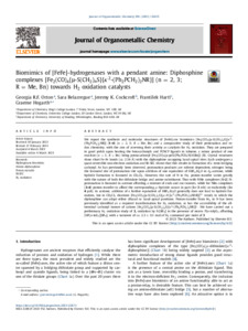 We report the synthesis and molecular structures of [FeFe]-ase biomimics [Fe 2 (CO) 4 {μ-S(CH 2 ) n S}{ κ2 - (Ph 2 PCH 2 ) 2 NR}] ( 1–4 ) ( n = 2, 3; R = Me, Bn) and a comparative study of their protonation and re- dox chemistry, with the aim of assessing their activity as catalysts for H 2 oxidation. They are prepared in good yields upon heating the hexacarbonyls and PCNCP ligands in toluene, a minor product of one reaction ( n = 3, R = Bn) being pentacarbonyl [Fe 2 (CO) 5 (μ-pdt){Ph 2 PCH 2 N(H)Bn}] ( 5 ). Crystal structures show short Fe-Fe bonds (ca. 2.54 ˚A) with the diphosphine occupying basal-apical sites. Each undergoes a quasi-reversible one-electron oxidation and IR-SEC shows that this results in formation of a semi-bridging carbonyl. As has previously been observed, protonation products are solvent dependent, nitrogen being the favoured site of protonation site upon addition of one equivalent of HBF 4 .Et 2 O in d 6 -acetone, while hydride formation is favoured in CD 2 Cl 2 . However, the rate of N to Fe 2 proton-transfer varies greatly with the nature of both the dithiolate-bridge and amine-substituent. Thus with NMe complexes ( 1–2 ) N- protonation is favoured in acetone affording a mixture of endo and exo isomers, while for NBn complexes ( 3–4 ) proton-transfer to afford the corresponding μ-hydride occurs in part (for 3 edt) or exclusively (for 4 pdt). In acetone, addition of a further equivalent of HBF 4 .Et 2 O generally does not lead to hydride for- mation, but in CD 2 Cl 2 dications [Fe 2 (CO) 4 {μ-S(CH 2 ) n S}( μ-H){ κ2 -(Ph 2 PCH 2 ) 2 NHR}] 2 + result, in which the diphosphine can adopt either dibasal or basal-apical positions. Proton-transfer from Fe 2 to N has been previously identified as a required transformation for H 2 oxidation, as has the accessibility of the all- terminal carbonyl isomer of cations [Fe 2 (CO) 4 {μ-S(CH 2 ) n S}{ κ2 -(Ph 2 PCH 2 ) 2 NR}] + . We have carried out a preliminary H 2 oxidation study of 3, oxidation by Fc[BF 4 ] in the presence of excess P(o-tolyl) 3 affording [HP(o-tol) 3 ][BF 4 ], with a turnover of ca. 2.3 ±0.1 mol of H 2 consumed per mole of 3.