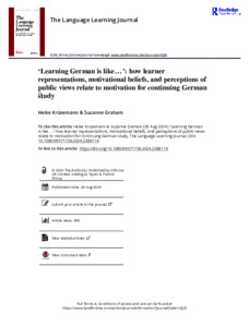 Krüsemann, H. and Graham, S. ORCID: https://orcid.org/0000-0002-7743-3977 (2025) “Learning German is like…”: how learner representations, motivational beliefs, and perceptions of public views relate to motivation for continuing German study. Language Learning Journal, 53 (4). pp. 446-472. ISSN 1753-2167 doi: 10.1080/09571736.2024.2388116