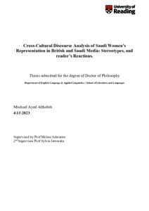 Althobiti, M. A. (2024) Cross-cultural discourse analysis of Saudi women's representation in British and Saudi media: stereotypes, and reader’s reactions. PhD thesis, University of Reading. doi: 10.48683/1926.00117782