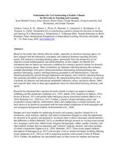 Viesca, K. M., Ailsaari, J., Flynn, N. ORCID: https://orcid.org/0000-0002-3710-9910, Hammer, S., Lemmrich, S., Routarinne, S. and Teemant, A. (2024) Orientations for co-constructing a positive climate for diversity in teaching and learning. In: Braselmann, S., Eibensteiner, L. and Volkmann, L. (eds.) Teacher Education in (Post-)Pandemic and (Post-)Digital Times: International Perspectives on Intercultural Learning, Diversity and Equity. Peter Lang, Oxford, pp. 59-78. ISBN 9783631872222 doi: 10.3726/b21759