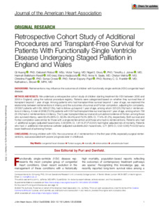 Huang, Q. ORCID: https://orcid.org/0000-0003-4456-2999, Ridout, D. ORCID: https://orcid.org/0000-0003-1336-6450, Tsang, V., Drury, N. E. ORCID: https://orcid.org/0000-0001-9012-6683, Jones, T. J. ORCID: https://orcid.org/0000-0001-8870-3496, Bellsham-Revell, H. ORCID: https://orcid.org/0000-0002-0360-944X, Hadjicosta, E. ORCID: https://orcid.org/0000-0002-1195-0760, Seale, A. N., Mehta, C. ORCID: https://orcid.org/0000-0002-4527-5265, Pagel, C. ORCID: https://orcid.org/0000-0002-2857-1628, Crowe, S. ORCID: https://orcid.org/0000-0003-1882-5476, Espuny Pujol, F. ORCID: https://orcid.org/0000-0001-9085-7400, Franklin, R. C. G. ORCID: https://orcid.org/0000-0002-1096-6242 and Brown, K. L. ORCID: https://orcid.org/0000-0002-0729-4959 (2024) Retrospective cohort study of additional procedures and transplant‐free survival for patients with functionally single ventricle disease undergoing staged palliation in England and Wales. Journal of the American Heart Association, 13 (14). e033068. ISSN 2047-9980 doi: 10.1161/jaha.123.033068