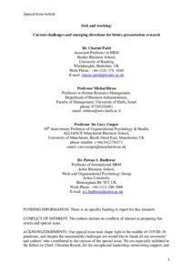 Patel, C., Biron, M., Cooper, C. and Budhwar, P. S. (2023) Sick and working: current challenges and emerging directions for future presenteeism research. Journal of Organizational Behavior, 44 (6). pp. 839-852. ISSN 1099-1379 doi: 10.1002/job.2727