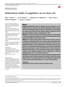 Owen, M. J., Wright, J. R., Tuddenham, E. G. D., King, J. R., Goodall, A. H. and Dunster, J. L. ORCID: https://orcid.org/0000-0001-8986-4902 (2024) Mathematical models of coagulation—are we there yet? Journal of Thrombosis and Haemostasis, 22 (6). pp. 1689-1703. ISSN 1538-7836 doi: 10.1016/j.jtha.2024.03.009