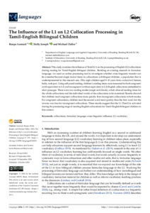 This study examines the influence of Tamil (L1) on the processing of English (L2) collocations during reading for Tamil-English bilingual children. Building on existing research in formulaic language, we used an online processing tool to investigate whether cross-linguistic transfer can be extended beyond single lexical items to collocations in bilingual children, a population which is underrepre-sented in this research area. 58 children aged 9–10 years from a school in Chennai, India took part. Using self-paced reading, children’s reading times were measured for both congruent (with equiv-alent in L2) and incongruent (without equivalent in L2) English collocations embedded in short passages. There were two reading modes (single and chunk) which allowed reading times for the whole collocations and the individual words of the collocations to be examined. Results showed that children read congruent collocations more quickly than incongruent collocations in both modes. For congruent collocations, children read the second word more quickly than the first word, but the reverse was true for incongruent collocations. These results suggest that the L1(Tamil) is activated during the processing stage of reading English collocations for Tamil-English bilingual children in this context.