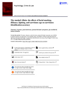 Nyman, T. J. ORCID: https://orcid.org/0000-0002-6409-2528, Korkman, J., Lampinen, J. M., Antfolk, J. and Santtila, P. (2025) The masked villain: the effects of facial masking, distance, lighting, and eyewitness age on eyewitness identification accuracy. Psychology, Crime and Law, 31 (3). pp. 332-370. ISSN 1477-2744 doi: 10.1080/1068316X.2023.2242999