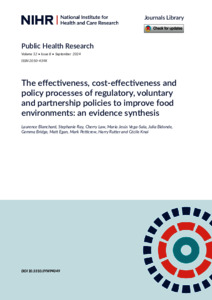 Blanchard, L. ORCID: https://orcid.org/0000-0003-0090-917X, Ray, S. ORCID: https://orcid.org/0000-0001-8403-9233, Law, C. ORCID: https://orcid.org/0000-0003-0686-1998, Vega-Sala, M. J. ORCID: https://orcid.org/0000-0002-5798-7091, Bidonde, J. ORCID: https://orcid.org/0000-0001-7535-678X, Bridge, G. ORCID: https://orcid.org/0000-0001-7441-9849, Egan, M. ORCID: https://orcid.org/0000-0002-4040-200X, Petticrew, M. ORCID: https://orcid.org/0000-0002-6378-5517, Rutter, H. ORCID: https://orcid.org/0000-0002-9322-0656 and Knai, C. ORCID: https://orcid.org/0000-0001-6663-7379 (2024) The effectiveness, cost-effectiveness and policy processes of regulatory, voluntary and partnership policies to improve food environments: an evidence synthesis. Public Health Research, 12 (8). pp. 1-173. ISSN 2050-439X doi: 10.3310/jywp4049