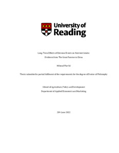 Plavšić, M. (2023) Long-term effects of extreme events on nutrient intake: evidence from The Great Famine in China. PhD thesis, University of Reading. doi: 10.48683/1926.00118934