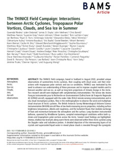 Rivière, G., Delanoë, J., Doyle, J. D., Methven, J. ORCID: https://orcid.org/0000-0002-7636-6872, Barrell, C., Fearon, M., Gray, S. ORCID: https://orcid.org/0000-0001-8658-362X, Johnson, A., Jourdan, O., Lachlan-Cope, T., Renfrew, I., Torn, R. D., Volonté, A. ORCID: https://orcid.org/0000-0003-0278-952X, Weiss, A., Wimmer, M., Aubry, C., Baudoux, A., Bazile, E., Beeden, D., Bennett, M., Biernat, K., Bitz, C. M., Blanchard-Wrigglesworth, E., Bounissou, S., Bray, M., Burg, T., Burzdak, J., Businger, S., Capute, P., Caudoux, C., Cavallo, S., Cossalter, L., Cozzolino, C., Croad, H., Douet, V., Elvidge, A., Finocchio, P., Gourbeyre, C., Harvey, B. ORCID: https://orcid.org/0000-0002-6510-8181, Huet, K., Hutchinson, T., Ladkin, R., Marshland, K., Martinez-Alvarado, O. ORCID: https://orcid.org/0000-0002-5285-0379, Mioche, G., Pantillon, F., Paquette, C., Parsons, D. B., Persson, O., Raillard, L., Raut, J.-C., Seity, Y., Trules, J., Vignon, E. and Wang, X. (2024) The THINICE field campaign: interactions between Arctic cyclones, tropopause polar vortices, clouds and sea ice in summer. Bulletin of the American Meteorological Society, 105 (12). E2330-E2354. ISSN 1520-0477 doi: 10.1175/bams-d-23-0143.1