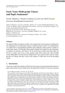 Borbely, D., Gehrsitz, M., McIntyre, S. ORCID: https://orcid.org/0000-0002-0640-7544, Rossi, G. ORCID: https://orcid.org/0000-0003-3594-0097 and Roy, G. (2023) Early years multi‐grade classes and pupil attainment. Oxford Bulletin of Economics and Statistics, 85 (6). pp. 1295-1319. ISSN 1468-0084 doi: 10.1111/obes.12561