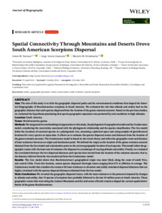 Barraza, J. M. ORCID: https://orcid.org/0000-0001-5232-0768, Avaria-Llautureo, J. ORCID: https://orcid.org/0000-0002-8610-7428 and Rivadeneira, M. M. ORCID: https://orcid.org/0000-0002-1681-416X (2024) Spatial connectivity through mountains and deserts drove South American scorpions dispersal. Journal of Biogeography, 52 (1). pp. 245-256. ISSN 1365-2699 doi: 10.1111/jbi.15030
