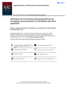 Townend, G. S. ORCID: https://orcid.org/0000-0002-5448-9046, Bartolotta, T. E. ORCID: https://orcid.org/0000-0003-2730-0815, Urbanowicz, A. ORCID: https://orcid.org/0000-0002-7909-4526, Wandin, H. ORCID: https://orcid.org/0000-0003-0002-7142 and Curfs, L. M.G. ORCID: https://orcid.org/0000-0001-9154-1395 (2020) Development of consensus-based guidelines for managing communication of individuals with Rett syndrome. Augmentative and Alternative Communication, 36 (2). pp. 71-81. ISSN 0743-4618 doi: 10.1080/07434618.2020.1785009