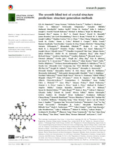 Hunnisett, L. M., Nyman, J., Francia, N. ORCID: https://orcid.org/0000-0003-0936-2342, Abraham, N. S. ORCID: https://orcid.org/0000-0002-4707-909X, Adjiman, C. S. ORCID: https://orcid.org/0000-0002-4573-7722, Aitipamula, S. ORCID: https://orcid.org/0000-0001-7640-9513, Alkhidir, T., Almehairbi, M., Anelli, A., Anstine, D. M., Anthony, J. E., Arnold, J. E. ORCID: https://orcid.org/0000-0002-6212-491X, Bahrami, F., Bellucci, M. A., Bhardwaj, R. M., Bier, I., Bis, J. A., Boese, A. D. ORCID: https://orcid.org/0000-0001-7388-778X, Bowskill, D. H. ORCID: https://orcid.org/0000-0003-2297-1126, Bramley, J. ORCID: https://orcid.org/0000-0003-0215-0355, Brandenburg, J. G., Braun, D. E. ORCID: https://orcid.org/0000-0003-0503-4448, Butler, P. W. V. ORCID: https://orcid.org/0000-0003-2842-836X, Cadden, J. ORCID: https://orcid.org/0000-0002-2747-7277, Carino, S., Chan, E. J., Chang, C., Cheng, B. ORCID: https://orcid.org/0000-0002-3584-9632, Clarke, S. M. ORCID: https://orcid.org/0009-0000-6355-5669, Coles, S. J. ORCID: https://orcid.org/0000-0001-8414-9272, Cooper, R. I. ORCID: https://orcid.org/0000-0001-9651-6308, Couch, R., Cuadrado, R., Darden, T., Day, G. M. ORCID: https://orcid.org/0000-0001-8396-2771, Dietrich, H. ORCID: https://orcid.org/0000-0003-2622-438X, Ding, Y., DiPasquale, A. ORCID: https://orcid.org/0000-0002-9265-8381, Dhokale, B. ORCID: https://orcid.org/0000-0001-7520-4727, van Eijck, B. P., Elsegood, M. R. J. ORCID: https://orcid.org/0000-0002-8984-4175, Firaha, D., Fu, W. ORCID: https://orcid.org/0000-0002-3552-9452, Fukuzawa, K. ORCID: https://orcid.org/0000-0001-5357-8250, Glover, J., Goto, H., Greenwell, C., Guo, R., Harter, J. ORCID: https://orcid.org/0009-0007-6923-5982, Helfferich, J., Hofmann, D. W. M., Hoja, J. ORCID: https://orcid.org/0000-0003-4138-2124, Hone, J. ORCID: https://orcid.org/0000-0002-1997-2796, Hong, R., Hutchison, G., Ikabata, Y. ORCID: https://orcid.org/0000-0003-3811-2908, Isayev, O., Ishaque, O. ORCID: https://orcid.org/0000-0002-6425-6107, Jain, V. ORCID: https://orcid.org/0000-0002-0937-2666, Jin, Y., Jing, A., Johnson, E. R. ORCID: https://orcid.org/0000-0002-5651-468X, Jones, I., Jose, K. V. J., Kabova, E., Keates, A., Kelly, P. F., Khakimov, D., Konstantinopoulos, S. ORCID: https://orcid.org/0000-0002-6546-4004, Kuleshova, L. N. ORCID: https://orcid.org/0000-0002-1656-4244, Li, H., Lin, X., List, A., Liu, C., Liu, Y. M., Liu, Z., Liu, Z.-P., Lubach, J. W., Marom, N. ORCID: https://orcid.org/0000-0002-1508-1312, Maryewski, A. A., Matsui, H. ORCID: https://orcid.org/0000-0003-1956-9603, Mattei, A., Mayo, R. A., Melkumov, J. W. ORCID: https://orcid.org/0000-0001-5440-2476, Mohamed, S. ORCID: https://orcid.org/0000-0002-5195-2533, Momenzadeh Abardeh, Z., Muddana, H. S., Nakayama, N. ORCID: https://orcid.org/0000-0002-1316-1861, Nayal, K. S., Neumann, M. A., Nikhar, R. ORCID: https://orcid.org/0000-0001-6828-7376, Obata, S., O'Connor, D., Oganov, A. R. ORCID: https://orcid.org/0000-0001-7082-9728, Okuwaki, K. ORCID: https://orcid.org/0000-0002-4510-5717, Otero-de-la-Roza, A., Pantelides, C. C., Parkin, S., Pickard, C. J., Pilia, L. ORCID: https://orcid.org/0000-0001-8753-7094, Pivina, T., Podeszwa, R., Price, A. J. A. ORCID: https://orcid.org/0000-0003-3239-8319, Price, L. S. ORCID: https://orcid.org/0000-0002-7633-1987, Price, S. L., Probert, M. R. ORCID: https://orcid.org/0000-0002-2412-7917, Pulido, A., Ramteke, G. R., Rehman, A. U. ORCID: https://orcid.org/0000-0003-4330-2837, Reutzel-Edens, S. M., Rogal, J. ORCID: https://orcid.org/0000-0002-6268-380X, Ross, M. J. ORCID: https://orcid.org/0000-0003-1830-7150, Rumson, A. F. ORCID: https://orcid.org/0009-0004-1737-0267, Sadiq, G., Saeed, Z. M., Salimi, A. ORCID: https://orcid.org/0000-0003-0413-2185, Salvalaglio, M. ORCID: https://orcid.org/0000-0003-3371-2090, Sanders de Almada, L., Sasikumar, K., Sekharan, S. ORCID: https://orcid.org/0000-0003-4747-2139, Shang, C., Shankland, K. ORCID: https://orcid.org/0000-0001-6566-0155, Shinohara, K., Shi, B. ORCID: https://orcid.org/0000-0001-9039-2156, Shi, X., Skillman, A. G., Song, H., Strasser, N. ORCID: https://orcid.org/0000-0003-3103-9701, van de Streek, J. ORCID: https://orcid.org/0000-0002-3026-4213, Sugden, I. J., Sun, G., Szalewicz, K., Tan, B. I., Tan, L., Tarczynski, F., Taylor, C. R., Tkatchenko, A., Tom, R., Tuckerman, M. E., Utsumi, Y., Vogt-Maranto, L., Weatherston, J. ORCID: https://orcid.org/0000-0002-8771-705X, Wilkinson, L. J. ORCID: https://orcid.org/0000-0003-2245-5922, Willacy, R. D., Wojtas, L., Woollam, G. R. ORCID: https://orcid.org/0000-0003-1417-1583, Yang, Z., Yonemochi, E. ORCID: https://orcid.org/0000-0001-5255-5129, Yue, X., Zeng, Q., Zhang, Y., Zhou, T., Zhou, Y., Zubatyuk, R. ORCID: https://orcid.org/0000-0002-7285-9389 and Cole, J. C. ORCID: https://orcid.org/0000-0002-0291-6317 (2024) The seventh blind test of crystal structure prediction: structure generation methods. Acta Crystallographica Section B Structural Science, Crystal Engineering and Materials, 80 (6). pp. 517-547. ISSN 2052-5206 doi: 10.1107/S2052520624007492