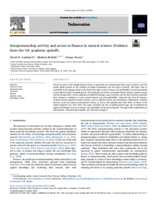 Audretsch, D. B., Belitski, M. ORCID: https://orcid.org/0000-0002-9895-0105 and Scarra, D. (2024) Intrapreneurship activity and access to finance in natural science: evidence from the UK academic spinoffs. Technovation, 129. 102888. ISSN 1879-2383 doi: 10.1016/j.technovation.2023.102888