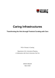 Bailer, S. (2024) Caring infrastructures: transforming the arts through feminist curating with care. PhD thesis, University of Reading. doi: 10.48683/1926.00119252