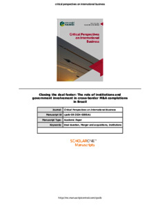Uncontrolled Keywords Deal duration, mergers and acquisitions, institutional distance, institutional quality, government involvement, institutional theory, resource-based view, emerging countries, Brazil