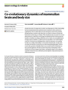 Venditti, C. ORCID: https://orcid.org/0000-0002-6776-2355, Baker, J. ORCID: https://orcid.org/0000-0003-4904-6934 and Barton, R. A. (2024) Co-evolutionary dynamics of mammalian brain and body size. Nature Ecology & Evolution, 8 (8). pp. 1534-1542. ISSN 2397-334X doi: 10.1038/s41559-024-02451-3