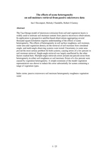 The s–x model of microwave emission from soil and vegetation layers is widely used to estimate soil moisture content from passive microwave observations. Its application to prospective satellite-based observations aggregating several thousand square kilometres requires understanding of the effects of scene heterogeneity. The effects of heterogeneity in soil surface roughness, soil moisture, water area and vegetation density on the retrieval of soil moisture from simulated single- and multi-angle observing systems were tested. Uncertainty in water area proved the most serious problem for both systems, causing errors of a few percent in soil moisture retrieval. Single-angle retrieval was largely unaffected by the other factors studied here. Multiple-angle retrievals errors around one percent arose from heterogeneity in either soil roughness or soil moisture. Errors of a few percent were caused by vegetation heterogeneity. A simple extension of the model vegetation representation was shown to reduce this error substantially for scenes containing a range of vegetation types.
