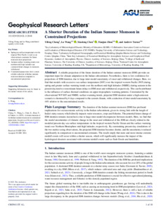 Cheng, Y., Wang, L., Chen, X., Zhou, T. and Turner, A. ORCID: https://orcid.org/0000-0002-0642-6876 (2025) A shorter duration of Indian summer monsoon in constrained projection. Geophysical Research Letters, 52 (1). e2024GL112848. ISSN 0094-8276 doi: 10.1029/2024GL112848