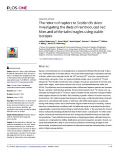 Waterman, J. ORCID: https://orcid.org/0009-0009-4326-6099, Black, S. ORCID: https://orcid.org/0000-0003-1396-4821, Sykes, N., Kitchener, A. C., Mills, W. F. ORCID: https://orcid.org/0000-0001-7170-5794 and Fellowes, M. D.E. ORCID: https://orcid.org/0000-0001-5431-8637 (2025) The return of raptors to Scotland’s skies: investigating the diets of reintroduced red kites and white-tailed eagles using stable isotopes. PLoS ONE, 20 (1). e0315945. ISSN 1932-6203 doi: 10.1371/journal.pone.0315945