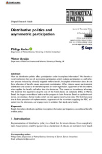 How do distributive politics affect participation under incomplete information? We theorize a novel mechanism that we call asymmetric participation, which explains participation as a self-selection process induced by a broadly targeted welfare benefit. Incomplete information about the de facto allocation of benefits causes asymmetric participation. When citizens expect particularistic distribution and access to the benefit depends on voter registration, supporters of the incumbent, who supplies the benefit, self-select into the electorate. This creates an incumbency advantage. We illustrate this argument using the case of the Renda Básica de Cidadania (RBC) in Maricá, Brazil, the largest unconditional cash transfer program in Latin America. Based on qualitative evidence, we develop a formal model, which we test against novel survey data. We find that under the de facto procedure of implementation, supporters of the incumbent supplying the RBC, self-select into the electorate, and engage more in activities that signal party loyalty.
