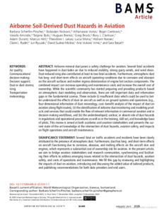 Scherllin-Pirscher, B., Nickovic, S., Votsis, A., Cvetkovic, B., Amiridis, V., Bolic, T., Brenot, H., Brock, G., Clarkson, R. J., Durant, A., Hirtl, M., Lekas, T. I., Mona, L., Nasser, H., Ryder, C. ORCID: https://orcid.org/0000-0002-9892-6113, Ryuzaki, J., Suarez-Molina, D., Vukovic Vimic, A. and Basart, S. (2025) Airborne soil-derived dust hazards in aviation. Bulletin of the American Meteorological Society, 106 (1). E125-E145. ISSN 1520-0477 doi: 10.1175/BAMS-D-23-0311.1