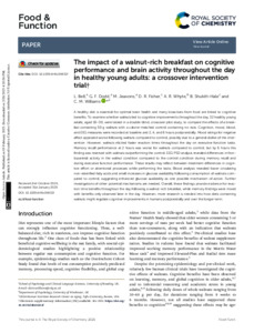 Bell, L. ORCID: https://orcid.org/0000-0003-0677-021X, Dodd, G. F., Jeavons, M., Fisher, D. R., Whyte, A. R., Shukitt-Hale, B. and Williams, C. M. ORCID: https://orcid.org/0000-0003-4452-671X (2025) The impact of a walnut-rich breakfast on cognitive performance and brain activity throughout the day in healthy young adults: a crossover intervention trial. Food & Function, 16. pp. 1696-1707. ISSN 2042-650X doi: 10.1039/D4FO04832F