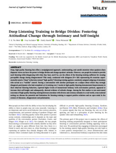 Moin, F. K. T. ORCID: https://orcid.org/0000-0002-9638-7830, Itzchakov, G. ORCID: https://orcid.org/0000-0003-1516-6719, Kasriel, E. ORCID: https://orcid.org/0009-0009-7684-8781 and Weinstein, N. ORCID: https://orcid.org/0000-0003-2200-6617 (2025) Deep listening training to bridge divides: fostering attitudinal change through intimacy and self‐insight. Journal of Applied Social Psychology, 55 (4). pp. 211-223. ISSN 1559-1816 doi: 10.1111/jasp.13086