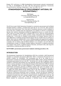The ISO has issued a Draft International Standard on construction procurement and the British Standards Institute is drafting a standard based upon this for use in the UK. Three questions arise from these observations. First, what kind of consultation processes would be adequate to ensure that such a standard meets the requirements of an industry as diverse as construction? Second, why would an international standard be inappropriate for use in a country like UK? Third, what sort of issues should such a standard seek to cover? There are strong precedents for process standards, such as quality assurance, design management and workmanship on building sites. So the idea of a standard on procurement is not unusual. Moreover, there are many differences in tendering and procurement practice that are wasteful and even collusive or illegal. These issues are explored with a view to offering insights and suggestions for guidance based on the experiences in UK. The research method is first-hand observation of the drafting committee who are dealing with the British Standard. As an example to test and inform the standardization concept, six different standard guidance documents on tendering procedures are compared. This reveals a significant degree of diversity, and based on this, nine stages for implementing a tendering procedure are derived.
