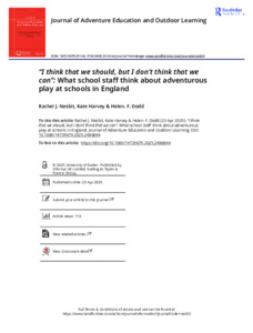 Nesbit, R. J., Harvey, K. ORCID: https://orcid.org/0000-0002-6819-0934 and Dodd, H. F. ORCID: https://orcid.org/0000-0003-1446-5338 (2025) “I think that we should, but I don’t think that we can”: what school staff think about adventurous play at schools in England. Journal of Adventure Education & Outdoor Learning. ISSN 1754-0402 doi: 10.1080/14729679.2025.2486844