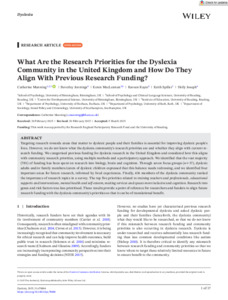 Manning, C. ORCID: https://orcid.org/0000-0001-6862-2525, Jennings, B., MacLennand, K., Rayat, R., Spiller, K. and Joseph, H. ORCID: https://orcid.org/0000-0003-4325-4628 (2025) What are the research priorities for the dyslexia community in the United Kingdom and how do they align with previous research funding? Dyslexia, 31 (2). e70004. ISSN 1099-0909 doi: 10.1002/dys.70004