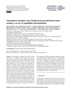 Kotthaus, S. ORCID: https://orcid.org/0000-0002-4051-0705, Bravo-Aranda, J. A. ORCID: https://orcid.org/0000-0002-2236-5241, Collaud Coen, M., Guerrero-Rascado, J. L. ORCID: https://orcid.org/0000-0002-8317-2304, Costa, M. J. ORCID: https://orcid.org/0000-0003-2981-2232, Cimini, D. ORCID: https://orcid.org/0000-0002-5962-223X, O'Connor, E. J. ORCID: https://orcid.org/0000-0001-9834-5100, Hervo, M. ORCID: https://orcid.org/0000-0003-3614-1297, Alados-Arboledas, L. ORCID: https://orcid.org/0000-0003-3576-7167, Jiménez-Portaz, M., Mona, L. ORCID: https://orcid.org/0000-0003-4157-0838, Ruffieux, D., Illingworth, A. ORCID: https://orcid.org/0000-0002-5774-8410 and Haeffelin, M. ORCID: https://orcid.org/0000-0001-9889-1507 (2023) Atmospheric boundary layer height from ground-based remote sensing: a review of capabilities and limitations. Atmospheric Measurement Techniques, 16 (2). pp. 433-479. ISSN 1867-8548 doi: 10.5194/amt-16-433-2023